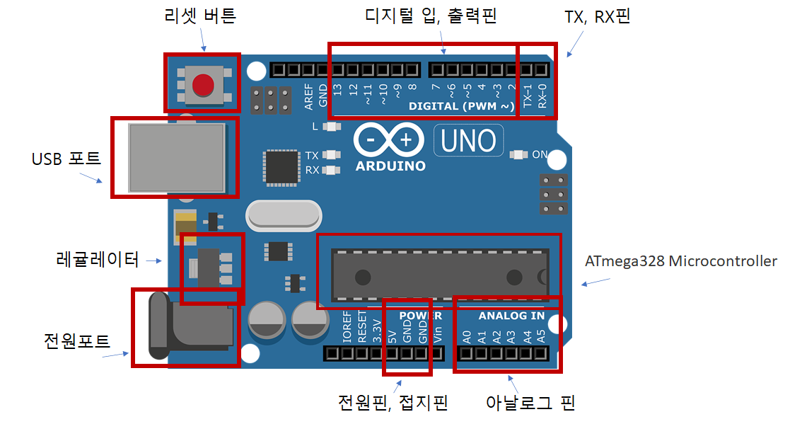 - 디지털 0번 핀과 1번핀에 있는 TX, RX핀은 블루투스, 와이파이, 아두이노와 아두이노간 송수신 핀으로 특별하게