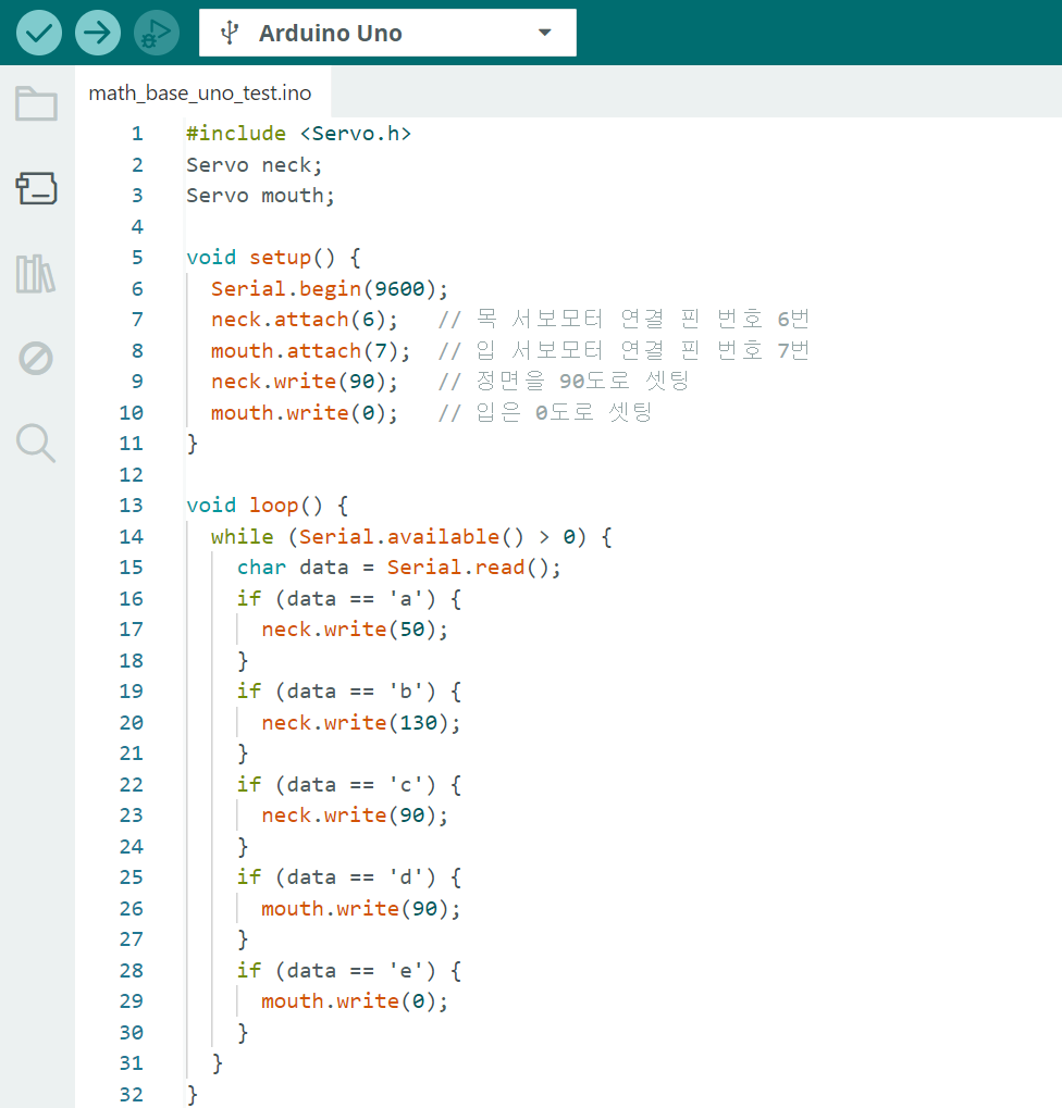 mouth.attach(7); // 입 서보모터 연결 핀 번호 7번