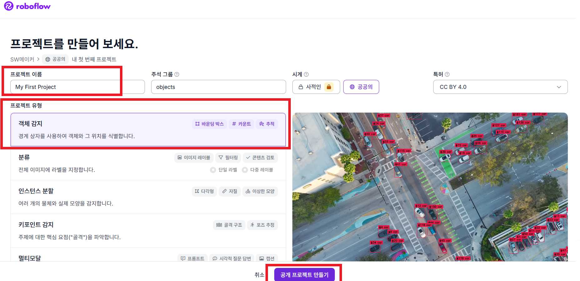 4. Roboflow 프로젝트 생성 화면 설명