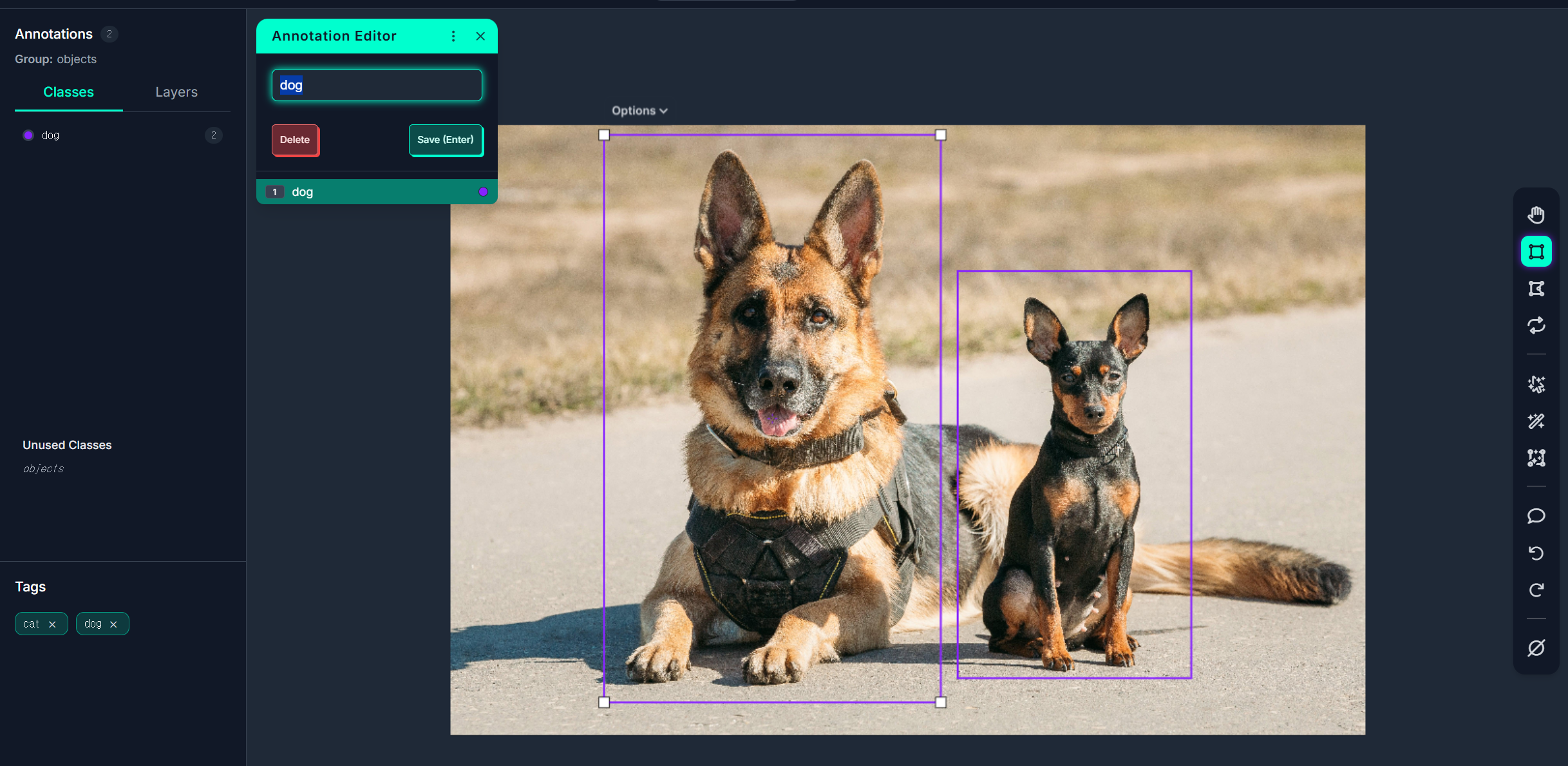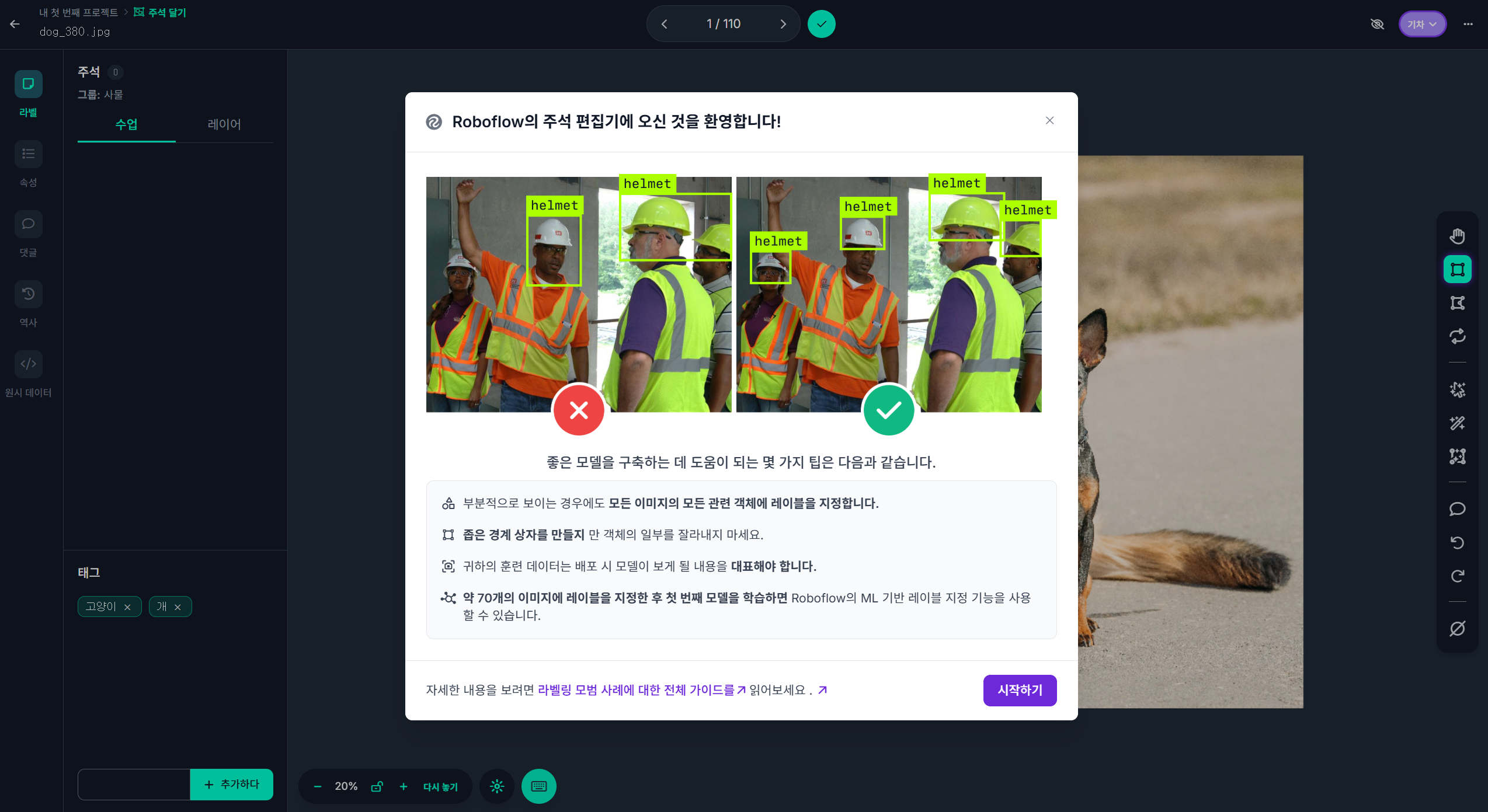 - Annotation Editor에 라벨 이름 입력: dog