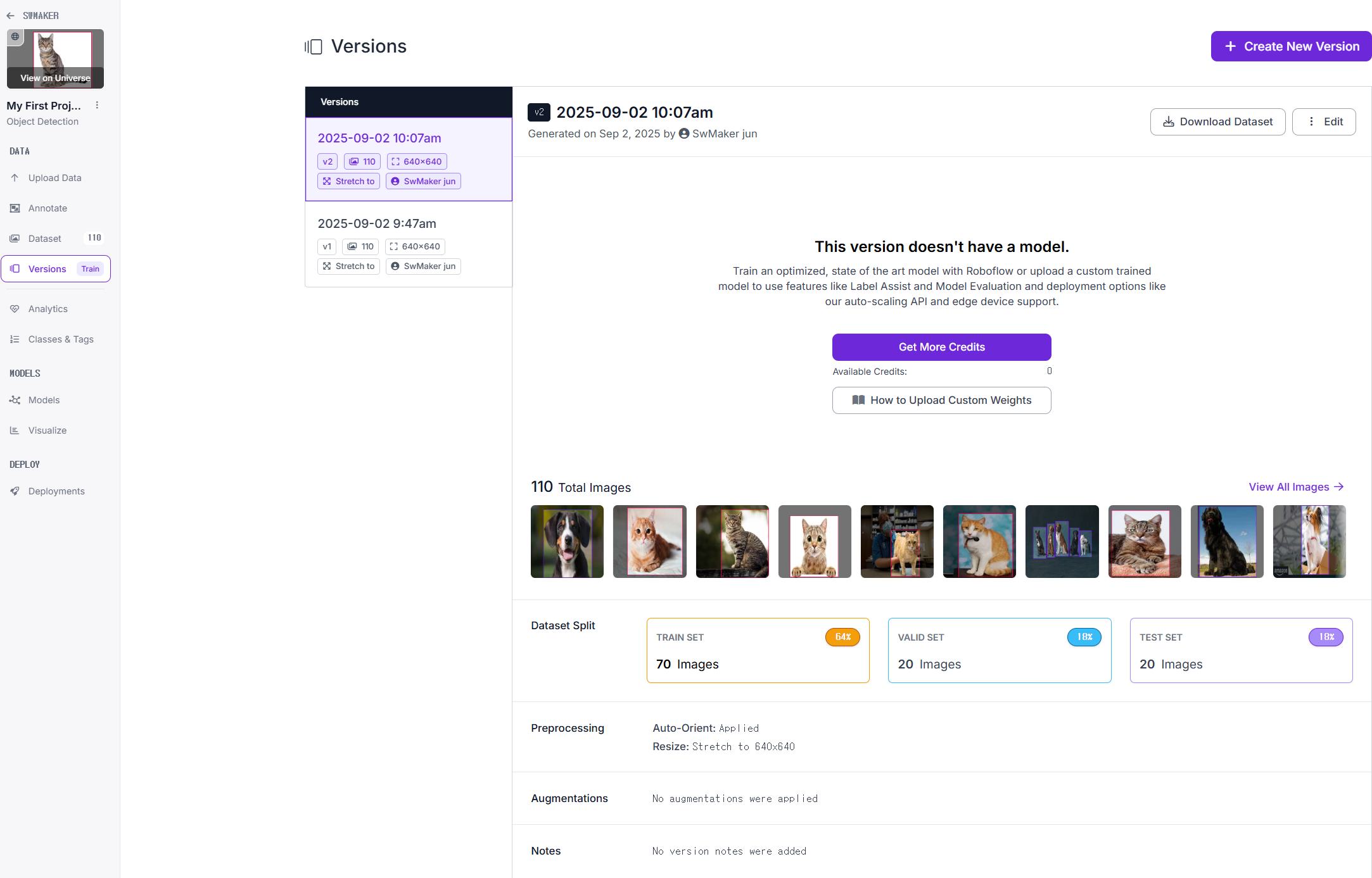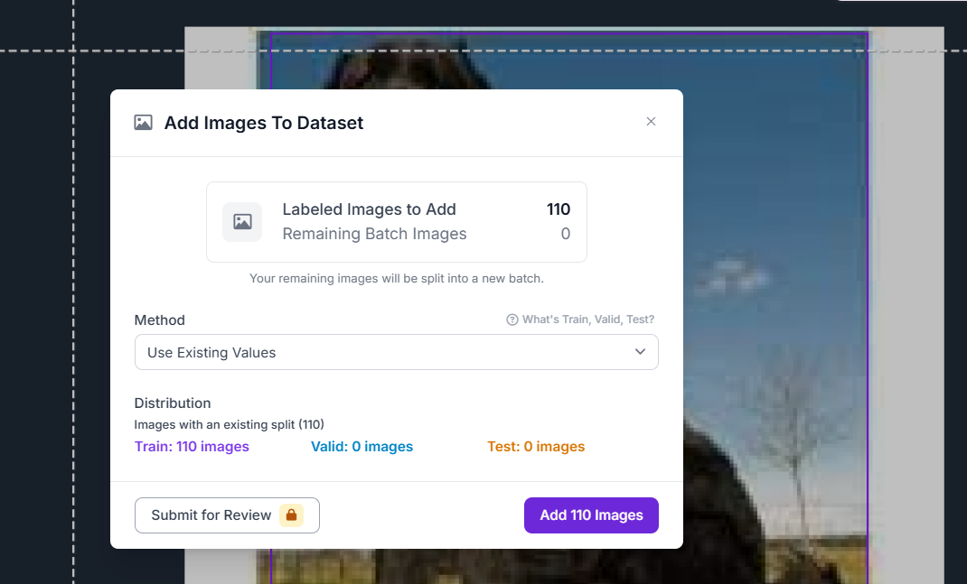 - 왼쪽 메뉴에서 Dataset (110) 표시 → 총 110장의 이미지가 포함된 데이터셋