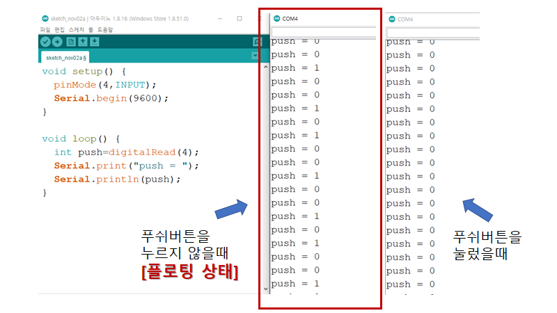 - 코드로 플로팅 값을 확인해 보자. [ 푸쉬버튼 한쪽 핀을 GND, 디지털핀으로 연결 ]