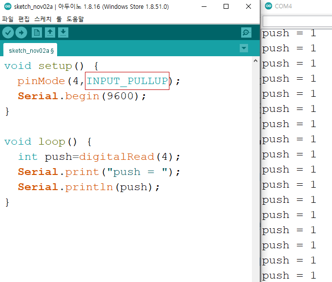- 푸쉬버튼을 누르지 않을때는 HIGH, 누를때는 LOW 값으로 출력