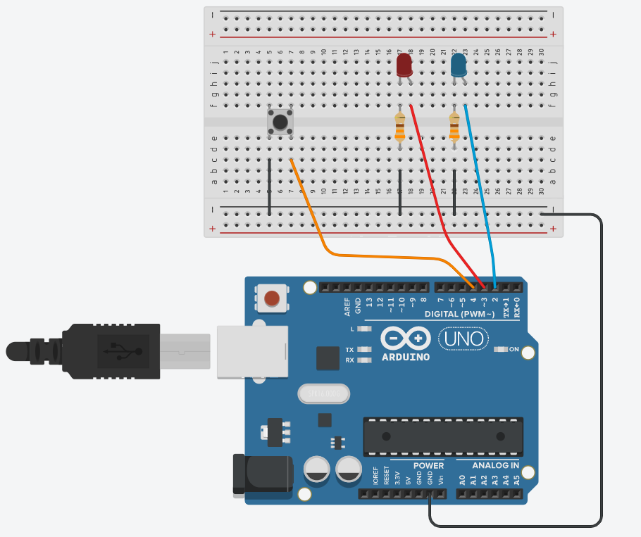 ■ 푸쉬버튼을 누를때 빨강 LED 와 파란LED가 교차로 깜빡거리기. ( delay( ) 코드가 핵심 ).
