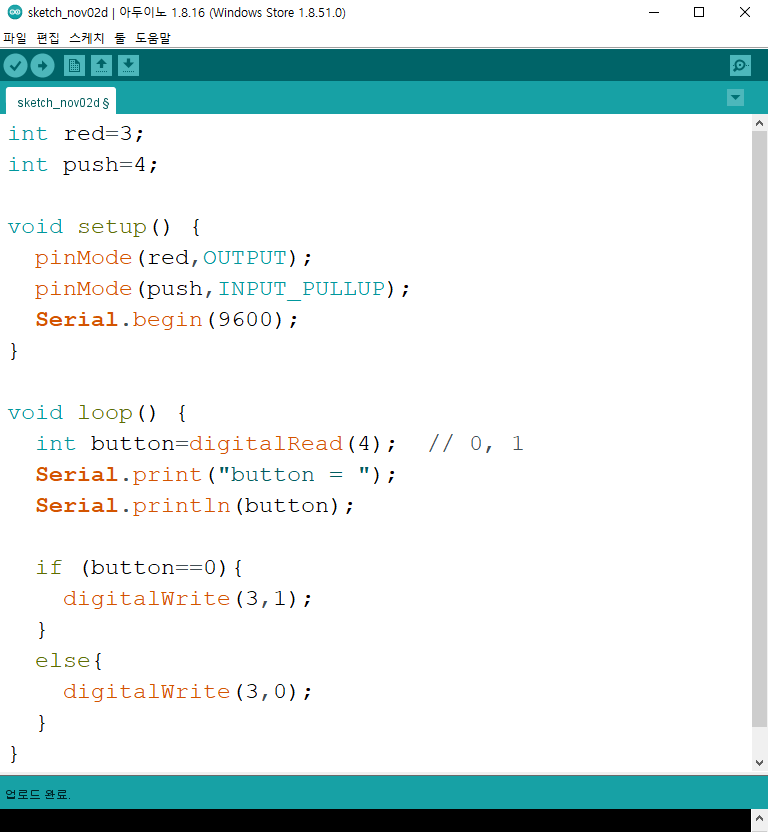 - led 하나를 연결하여 푸쉬버튼을 눌렀을때 led ON, 누르지 않을때 led OFF