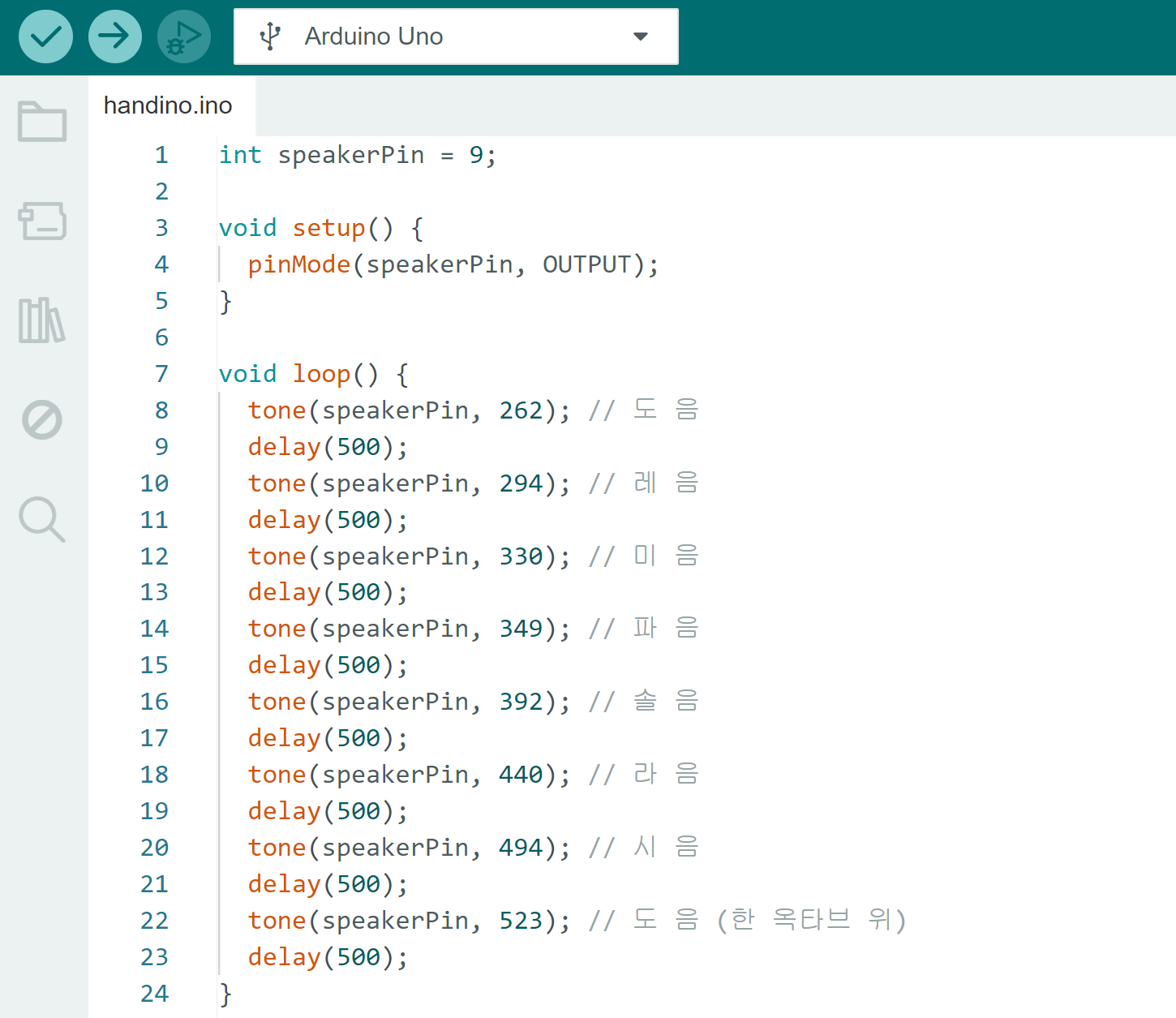 이제 피에조 스피커를 사용해 '도레미파솔라시도'를 연주해 봅시다.