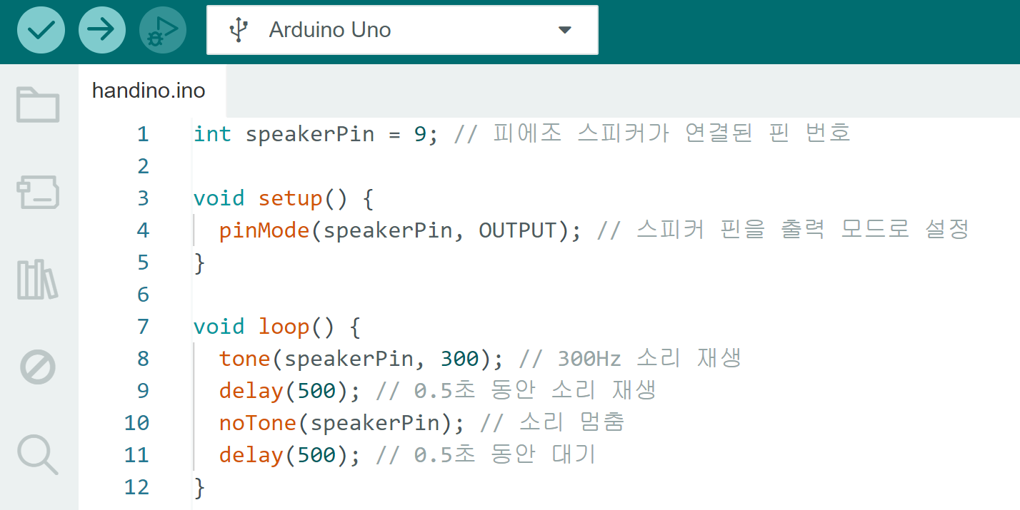 이 코드가 계속 반복되면서, 피에조 스피커는 0.5초 간격으로 300Hz 소리를 내고 멈추는 것을 반복합니다.