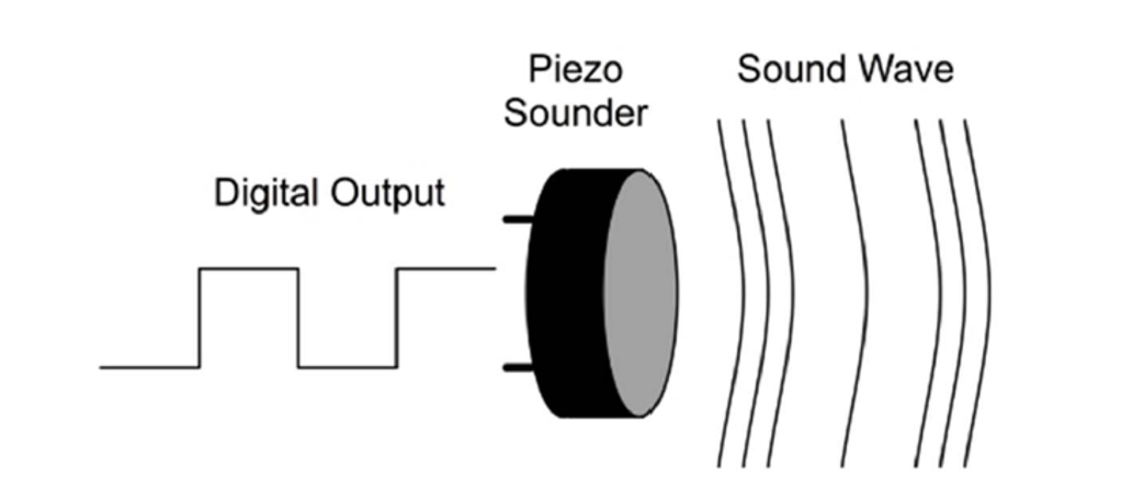 피에조 스피커는 매우 작고 저렴한 소리 출력 장치입니다. 전기 신호를 주면 얇은 필름이 진동하면서 소리를 냅니다. 이 원리를 이용해 우리는 다양한 소리를 만들어낼 수 있습니다.