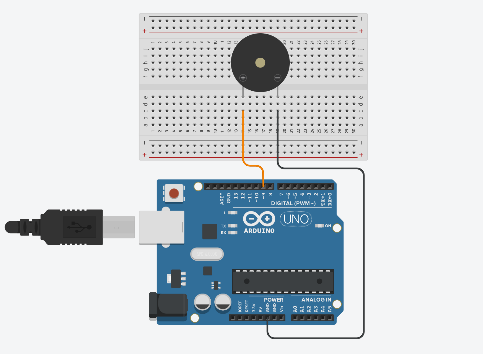 - 피에조 스피커의 한쪽을 아두이노의 디지털 핀(예: 9번)에 연결합니다.