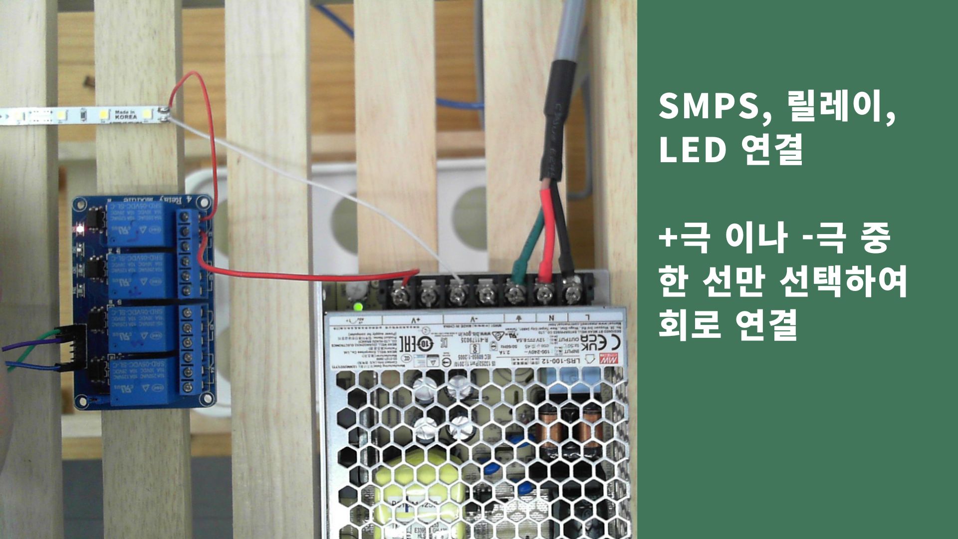 1. SMPS에 연결되어 있던 식물성장 LED + 핀을 빼서 릴레이 1채널 NC 단자에 연결
