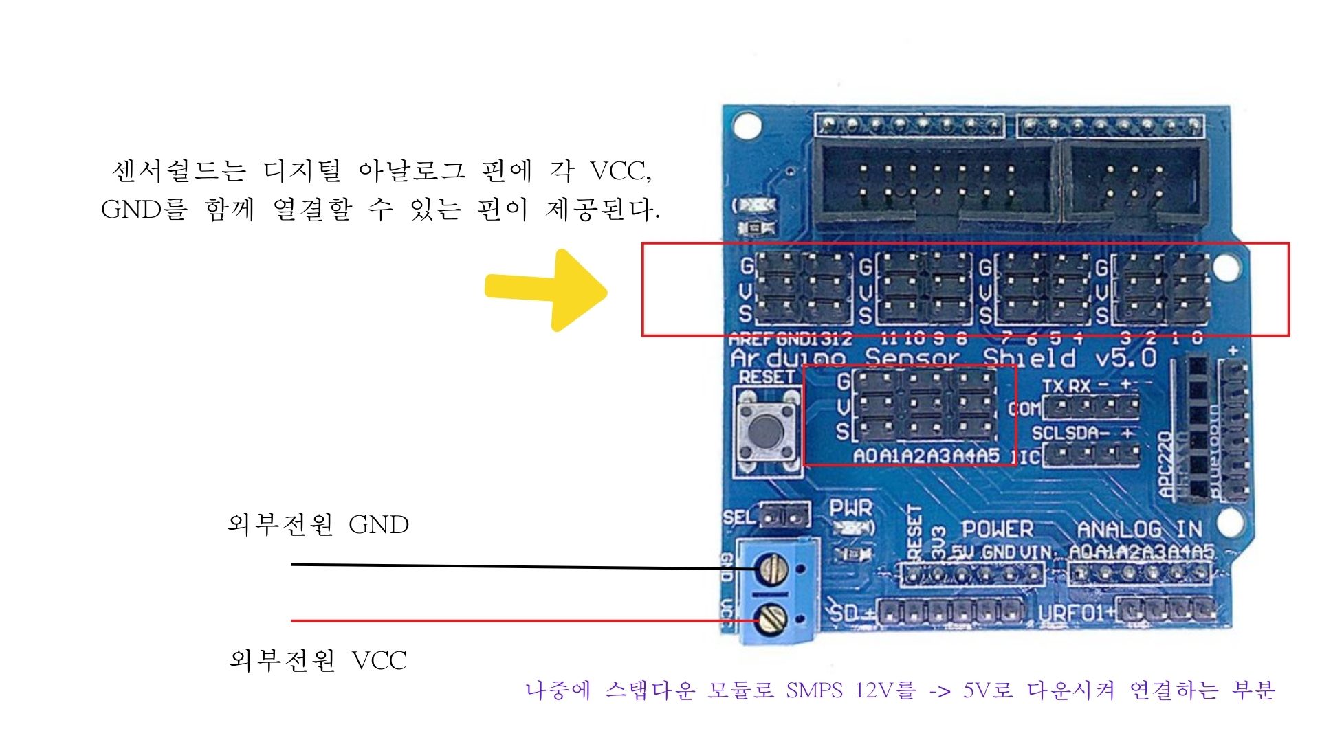 디지털, 아날로그 각 핀에 VCC, GND 핀이 함께 사용이 가능하도록 확장되어 있음.
