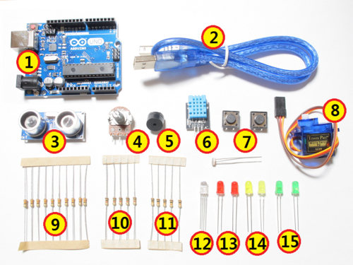 1. 아두이노 우노 2. USB 케이블 3. 초음파센서 4. 가변저항 5. 피에조 부저 6. 온습도센서