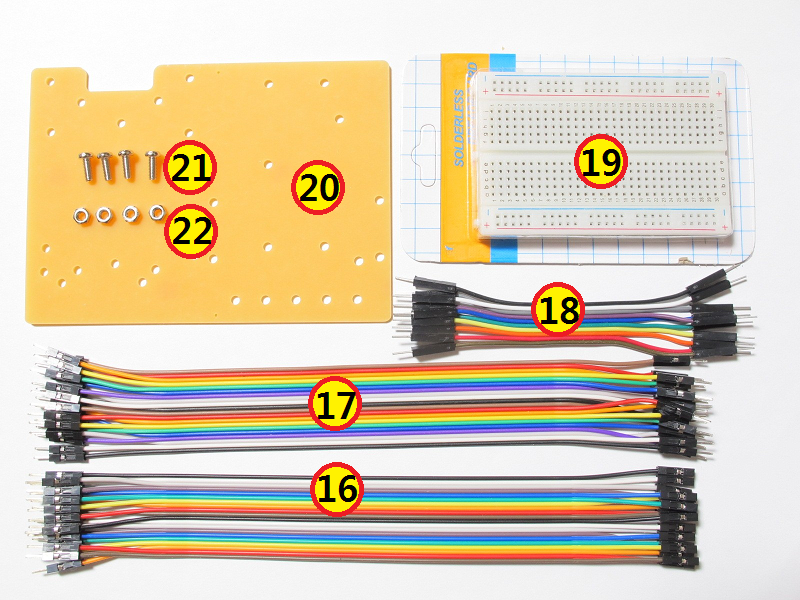16. 암-수 케이블 17~18. 수-수 케이블 19. 브레드보드 20~22. 아두이노 거치판