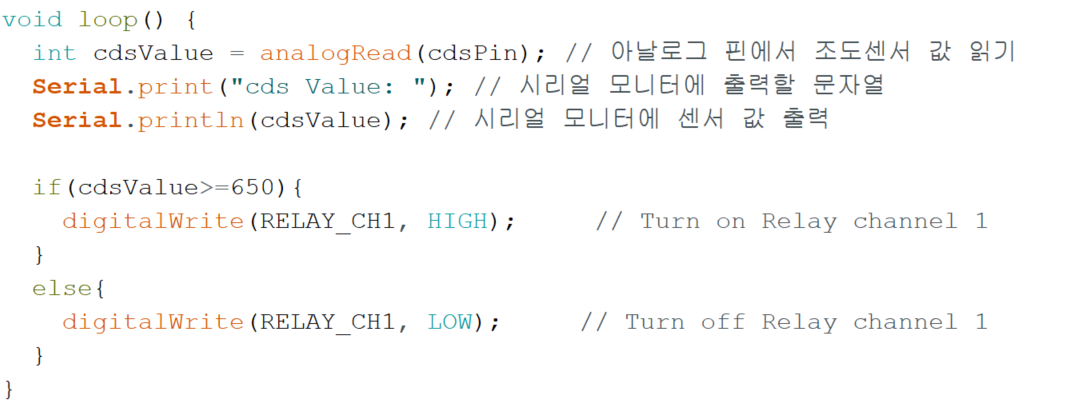 int cdsValue = analogRead(cdsPin); // 아날로그 핀에서 조도센서 값 읽기