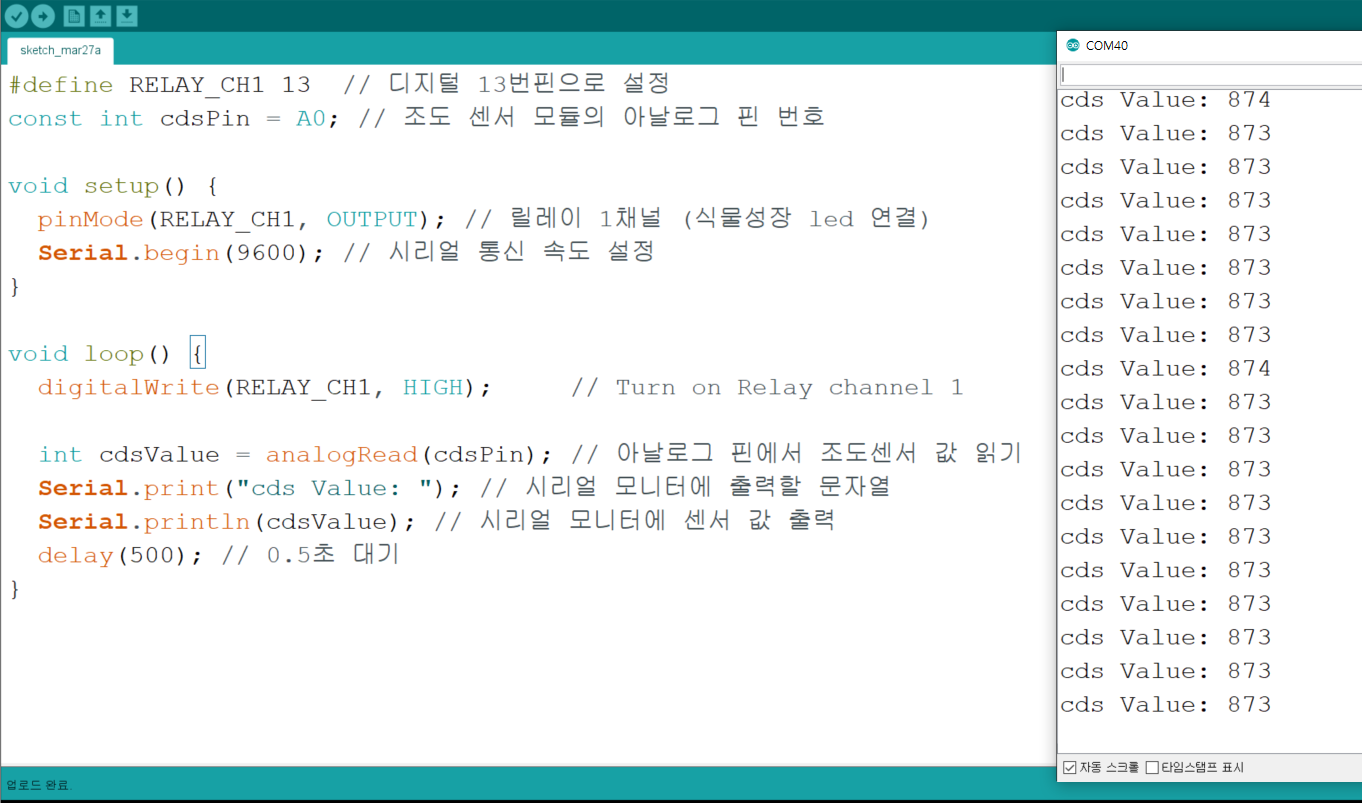 Serial.println(cdsValue); // 시리얼 모니터에 센서 값 출력