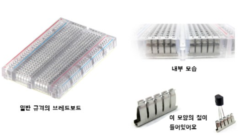 - 브레드 보드 속에는 금속띠가 존재하고 그 위에 플라스틱으로 덮어 구멍이 격자 모양으로 나있음.