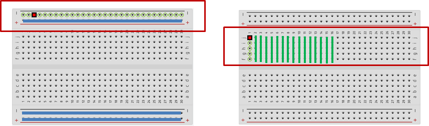 - 브레드보드는 회로단과 전원단으로 구분
