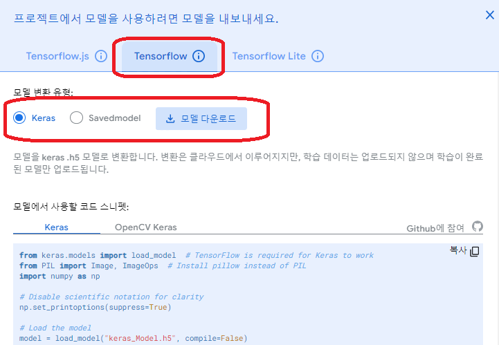 - "Tensorflow" : 파이썬을 활용할 수 있도록 모델파일과 label 파일을 다운받을 수 있음.