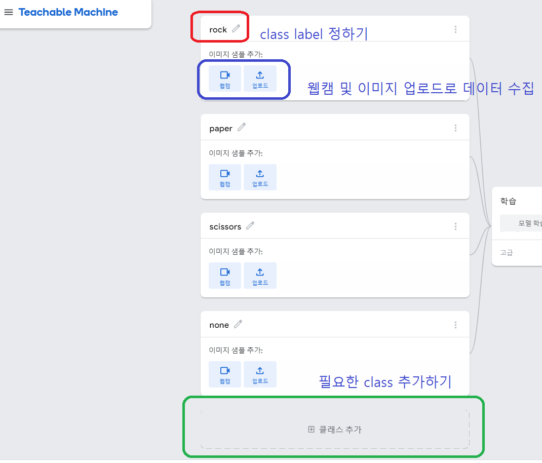- 각 class에 label 이름을 붙여주고 100장 정도의 가위, 바위, 보 데이터를 수집하자