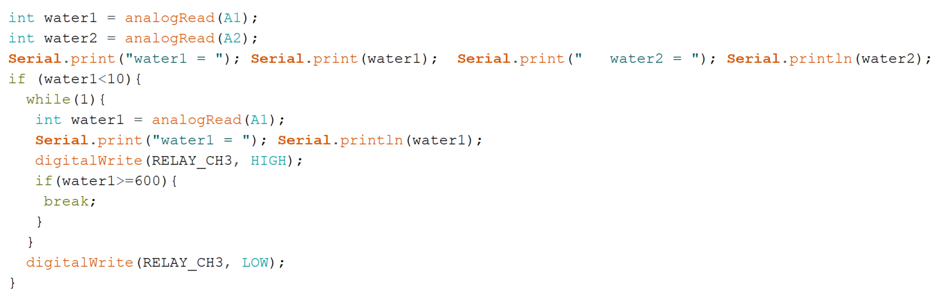 1. 물의 수위가 수위센서 밑으로 내려가게 되면 센서값이 10보다 작아지고 이를 조건문에서