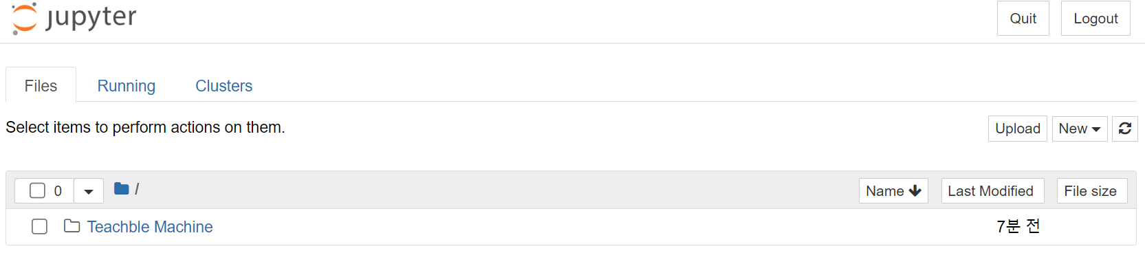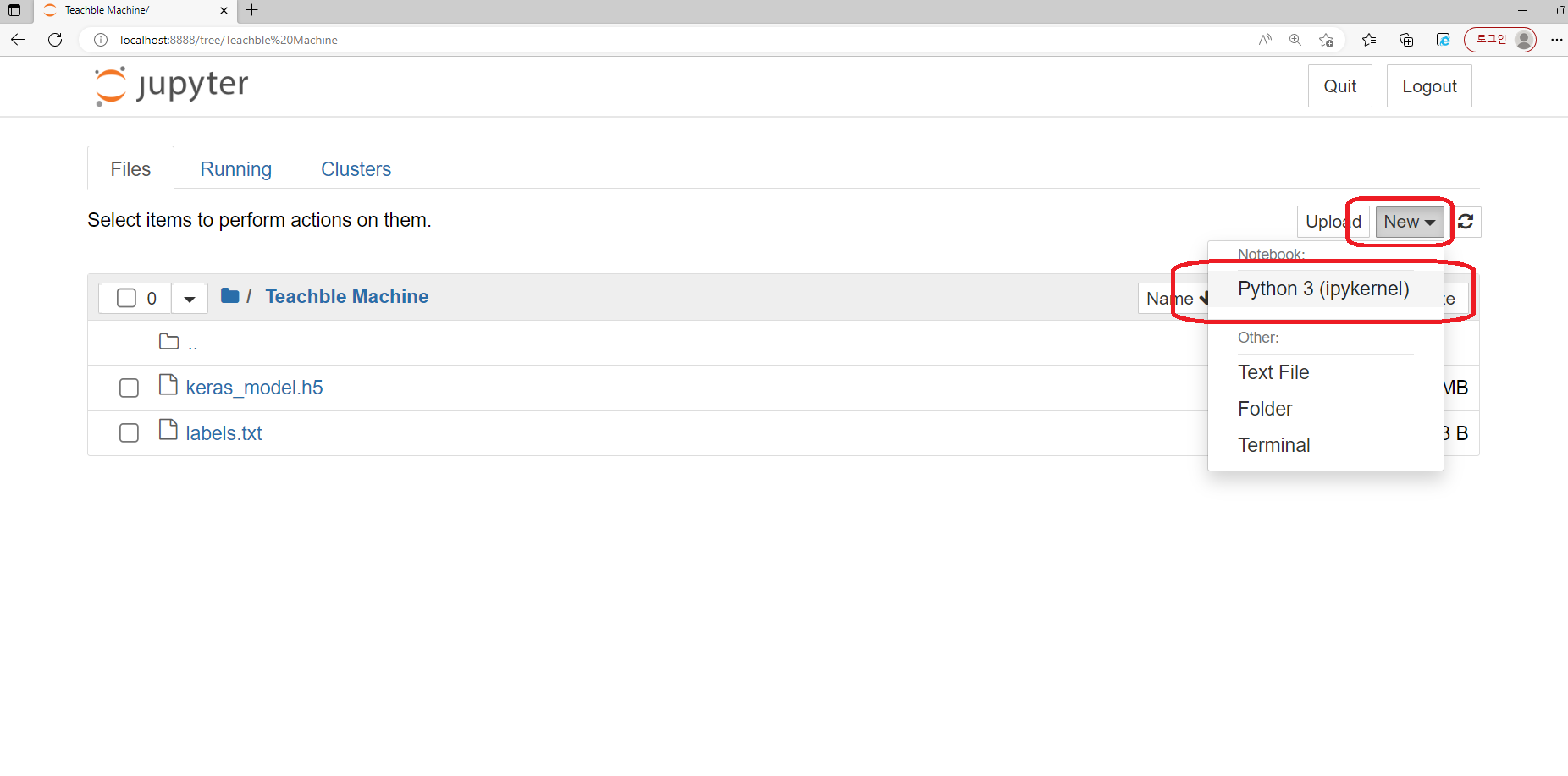 - 이동하면 위에서 작업한 모델파일과 labels 텍스트 파일이 보일 것이고, 파이썬 작업을 위해 오른쪽 위