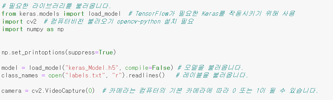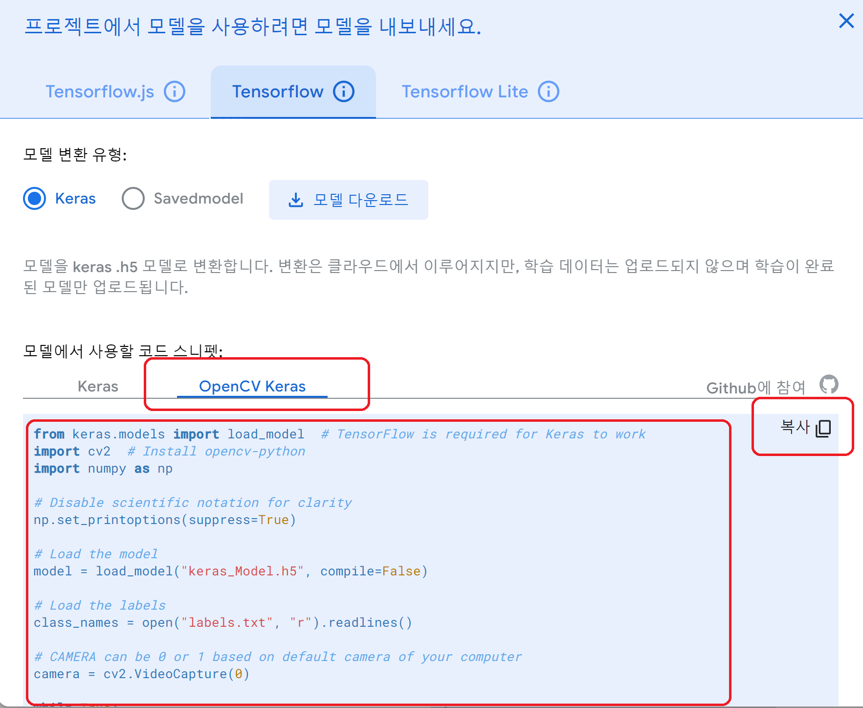 - 티처블머신 모델 내보내기에서 아래 OpenCV Keras 코드를 복사해 오기.
