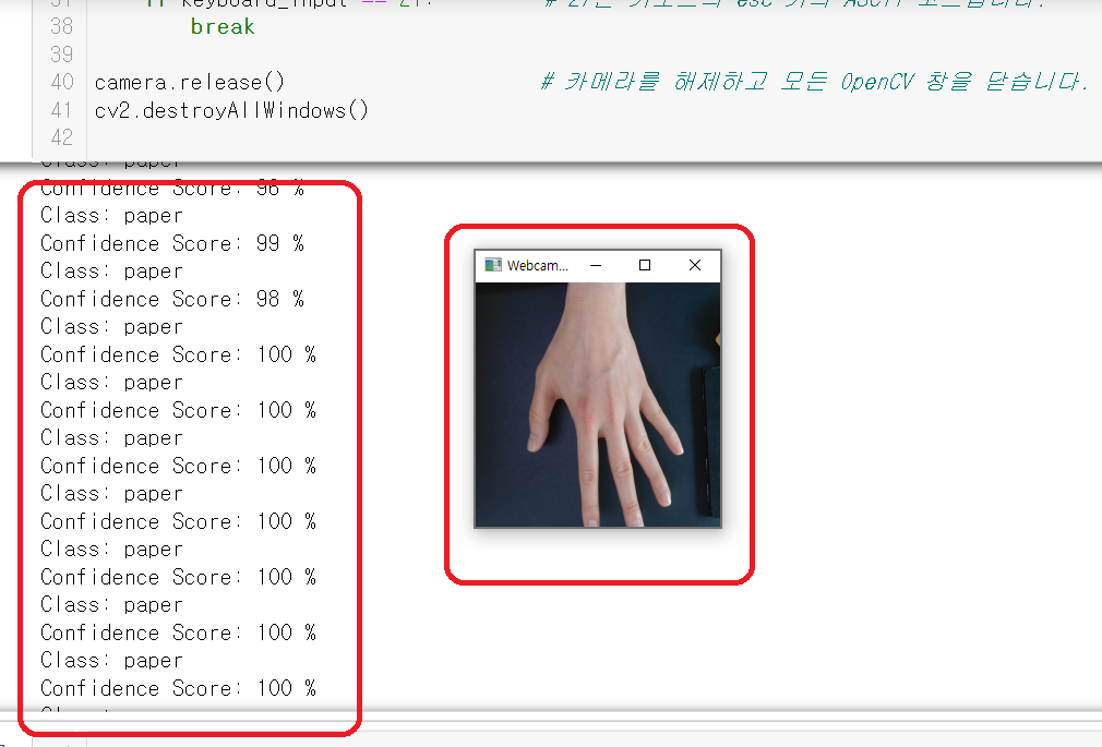 - print 문으로 출력되어 분류되는 예측 부분을 읽기에 불편함이 있으므로 다음 내용은 웹캠 실행 창 화면