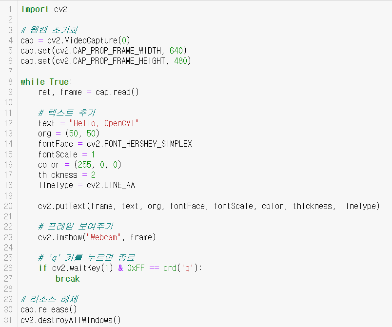 예를 들어, 아래 코드는 웹캠에서 "Hello, OpenCV!"라는 텍스트를 삽입하는 예제입니다