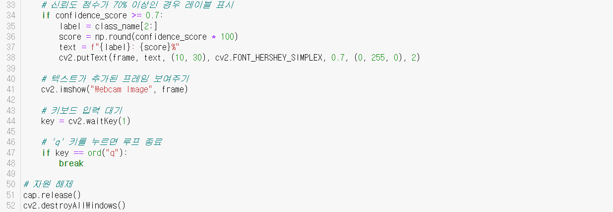 2. 조건문 70 이상일때만 관련 label 명과 score 점수 출력하기 위한 putText 함수 활용하는 코드 입력.