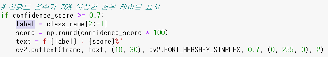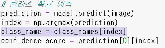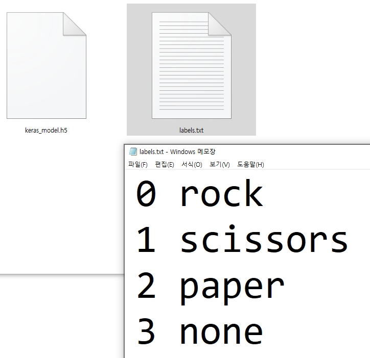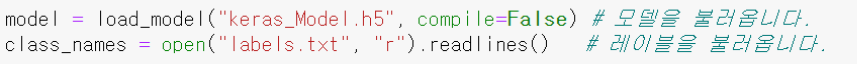 ※ 우리가 티처블 머신에서 학습하여 다운받은 파일중 labels.txt 파일을 열어보면 label 명을 확인할 수 있음.