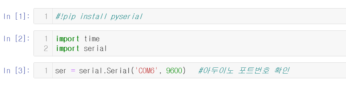 - 만약, import serial 에서 에러가 나면 위 사진 1번과 같이 ' !pip install pyserial ' 명령으로 라이브러리 설치