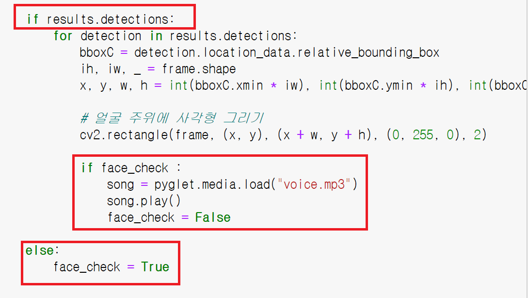 : 얼굴 체크하는 변수를 선언한 이유는 얼굴이 객체인식되어 무한 반복 mp3 중복 출력을 방지하기 위해서 이다.