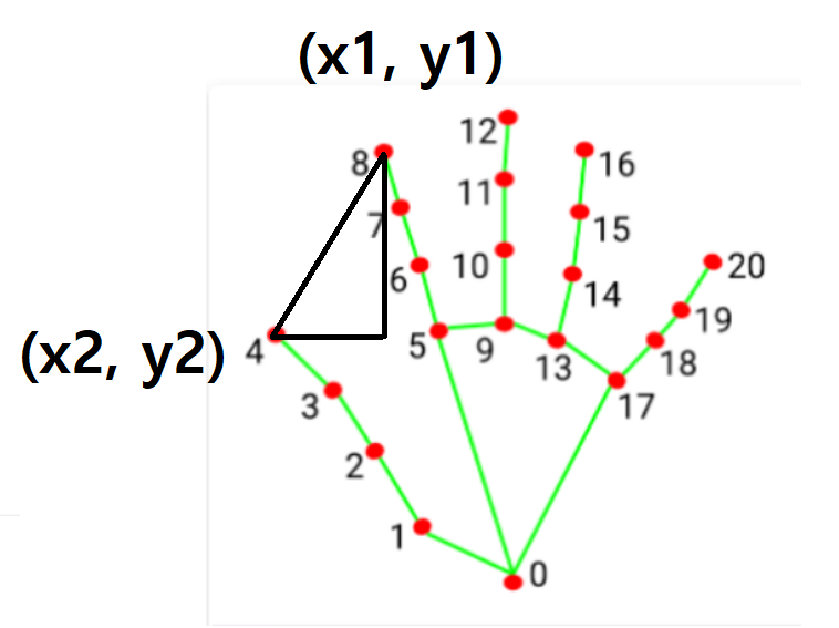이 코드는 두 점 (x좌표, y좌표)와 (x2좌표,y2좌표) 사이의 유클리드 거리를 계산하는 코드입니다.