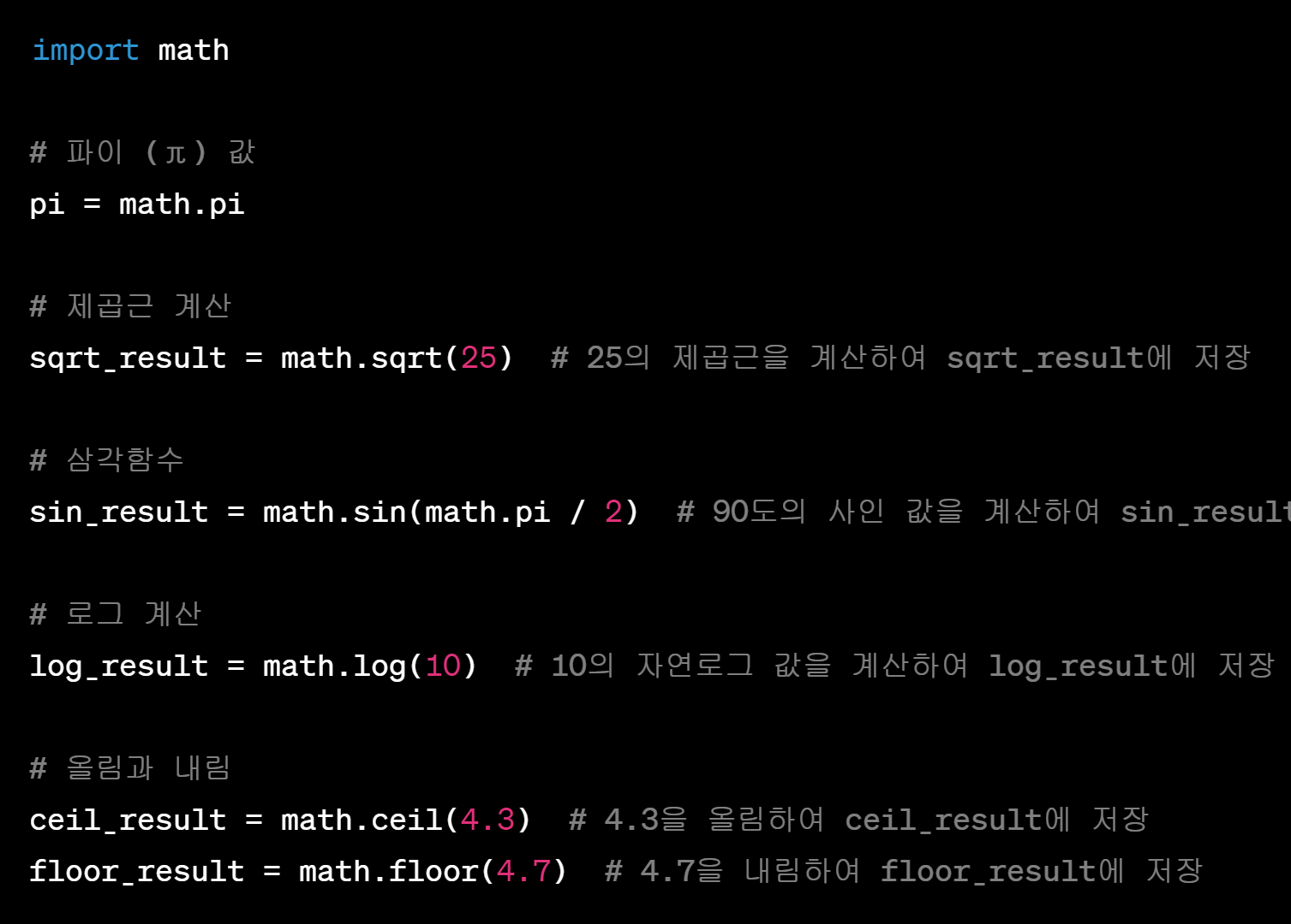 예를 들어, 파이 (π) 값을 가져오려면 math.pi를 사용할 수 있다.