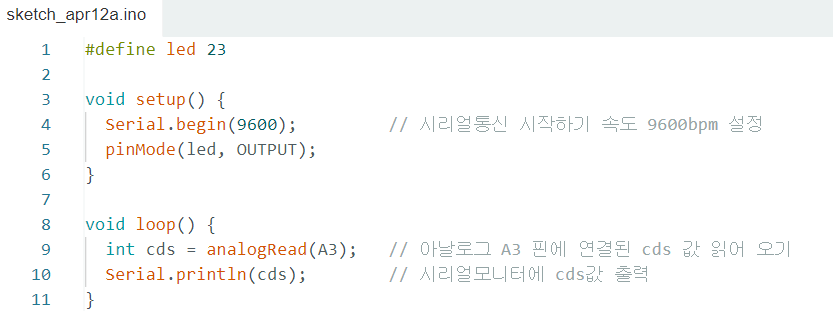 int cds = analogRead(A3); // 아날로그 A3 핀에 연결된 cds 값 읽어 오기
