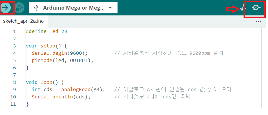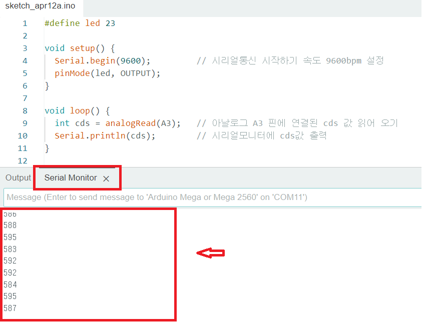 Serial.println(cds); // 시리얼모니터에 cds값 출력