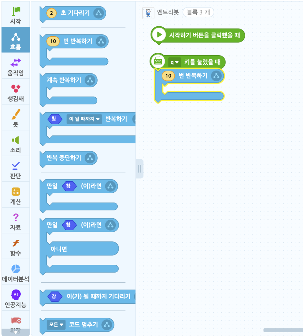 흐름에 들어가면 10번 반복하기, 계속 반복하기, 만일 참이라면 등 다양한 블록이 있습니다