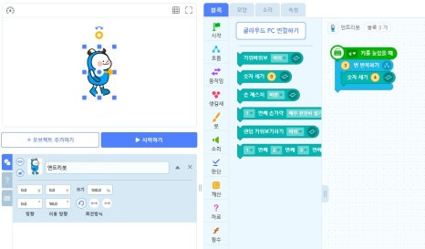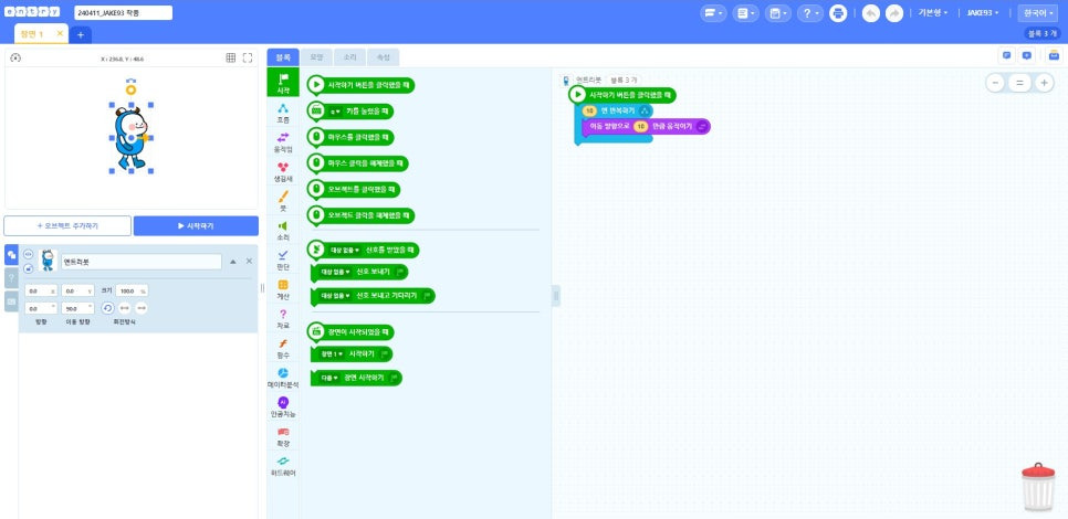 보통 엔트리를 활용할 때에는 왼쪽의 오브젝트를 움직이기위해서