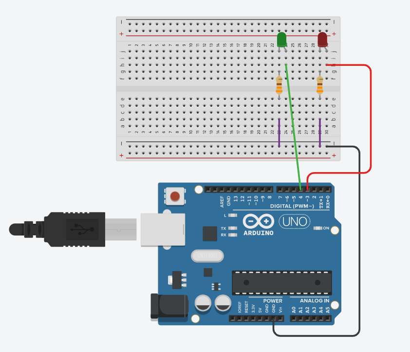 - 초록 led, 빨강 led, 저항(330Ω) 2개, 수-수 케이블 선