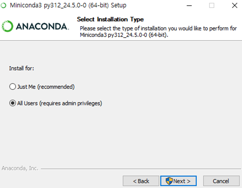 가상환경 설치 시, Conda가 내부적으로 다양한 설정 파일이나 환경 변수를 업데이트할 수 있습니다. 이러한 설정 변경은 일반 사용자 권한으로는 수행할 수 없는 경우가 많기 때문에, 관리자 권한이 필요합니다. 특히, 시스템의 전역 패키지를 업데이트하거나 삭제할 때는 관리자 권한이 필수적입니다.