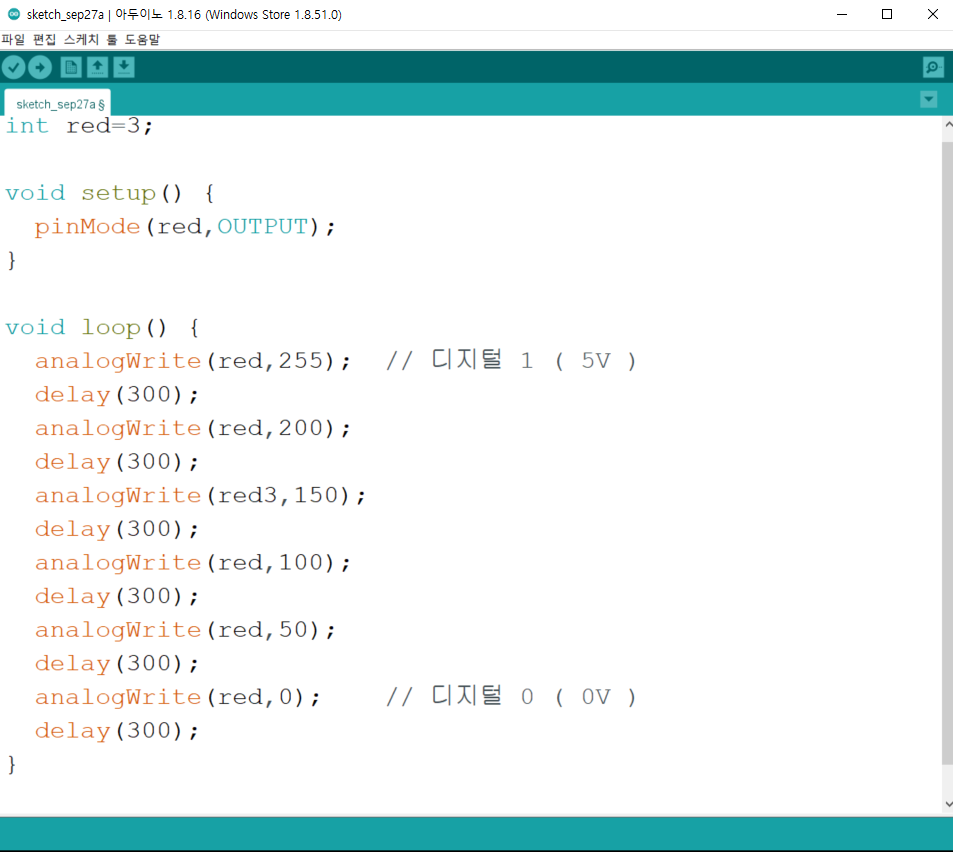 - 디지털 PWM 활용 핀에서 analogWrite 명령코드로 0 ~ 255 (0 ~ 5V)의 신호를 출력할 수 있음.